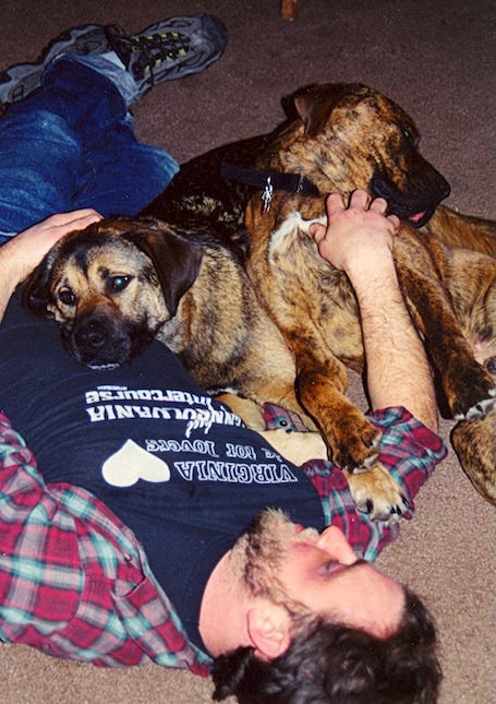 Bo was a 105 lb. (47.5 kilos) pitbull-mastiff who luckily the world made sure came home with me from a rural animal shelter outside of Des Moines, Iowa in November 2000. It was a comical ruse how the staff got me to adopt him. I’d been working on a theatre set in the early autumn days of Des Moines. A college student, apprenticing with me on the set, and I were talking about dogs. I said something like “I always wanted a larger breed dog, but my older brother got to choose from the shelter - (we ended up with Cleopatra, a basset hound with plenty of personality). But I don’t have the time for one.”